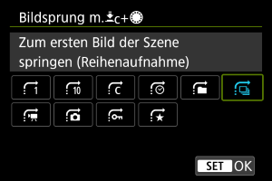 Um einzustellen, wie die Kamera Bildwechsel vornimmt, können Sie das -Wahlrad auf dem Wiedergabebildschirm in der Einzelbildanzeige drehen, während Sie auf die Taste drücken, die [