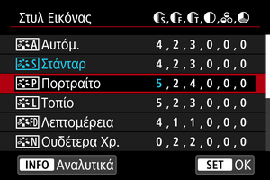 - Για να αποθηκεύσετε την επιλεγμένη ρύθμιση και να επιστρέψετε στην οθόνη επιλογής Στυλ εικόνας, πατήστε το πλήκτρο