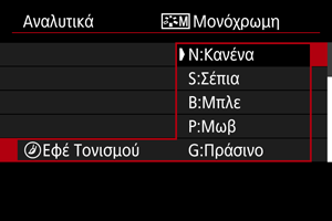 Εφαρμόζοντας ένα εφέ τονισμού, μπορείτε να δημιουργήσετε μια μονόχρωμη εικόνα στο επιλεγμένο χρώμα. Είναι χρήσιμο όταν θέλετε να δημιουργήσετε ανεπανάληπτες εικόνες.