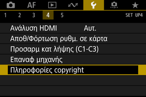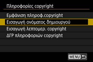 Αν επιλέξετε [Εμφάνιση πληροφ.copyright] στο βήμα 2, μπορείτε να ελέγξετε τις πληροφορίες [Δημιουργός] και [Copyright] που εισαγάγατε.