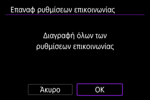 • Μπορείτε να διαγράψετε όλες τις ρυθμίσεις ασύρματης επικοινωνίας ορίζοντας την επιλογή [Ρυθμίσεις επικοινωνίας] για τη ρύθμιση [Άλλες ρυθμίσεις] στο στοιχείο [Διαμόρφωση: Επαναφ μηχανής].