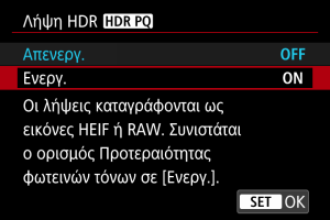 ] να έχει οριστεί σε [Ενεργ.], πριν από την προβολή σε οθόνη HDR, ορίστε τη ρύθμιση [