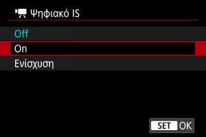 Η σταθεροποίηση εικόνας με Ψηφιακό IS ταινίας είναι απενεργοποιημένη.