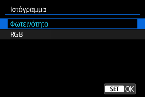 Τα ιστογράμματα εμφανίζουν τα επίπεδα του σήματος σε όλο το τονικό εύρος. Διατίθεται οθόνη φωτεινότητας (για τον έλεγχο του γενικού επιπέδου έκθεσης και της συνολικής διαβάθμισης) και οθόνη RGB (για τον έλεγχο του κορεσμού και της διαβάθμισης του κόκκινου, του πράσινου και του μπλε). Μπορείτε να αλλάξετε το ιστόγραμμα που εμφανίζεται, πατώντας το πλήκτρο όταν εμφανίζεται η ένδειξη [