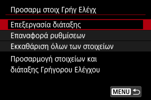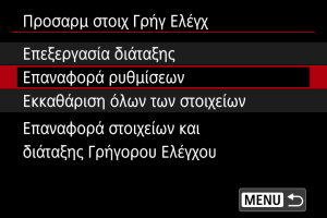 - Επιλέξτε [Επαναφορά ρυθμίσεων] για να επαναφέρετε τα προεπιλεγμένα στοιχεία της οθόνης Γρήγορου ελέγχου και την προεπιλεγμένη διάταξη.