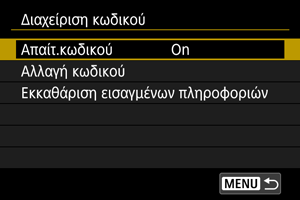 Χρησιμοποιήστε αυτές τις ρυθμίσεις για να διαχειριστείτε τον κωδικό πρόσβασης που έχει εισαχθεί, όταν ο διακόπτης λειτουργίας έχει τοποθετηθεί στη θέση ή η μηχανή συνεχίζει τη λειτουργία της από το αυτόματο σβήσιμο. Για οδηγίες σχετικά με τον ορισμό του κωδικού πρόσβασης που απαιτείται κατά την εκκίνηση της μηχανής, ανατρέξτε στη σελίδα Ορισμός κωδικού πρόσβασης.