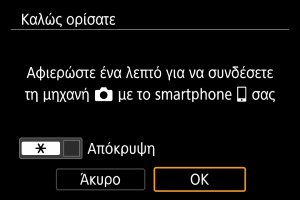 Οδηγίες σύνδεσης με smartphone εμφανίζονται, αν επιλέξετε [ΟΚ] όταν εμφανιστεί η οθόνη ρύθμισης ().
