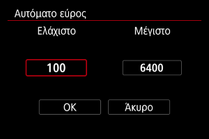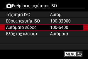Για την [AUTO] ISO, μπορείτε να ορίσετε το μέγιστο όριο ταχύτητας ISO.