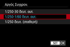 Μπορείτε να ορίσετε την ταχύτητα συγχρονισμού φλας για τη φωτογράφιση με φλας στην κατάσταση P ή Av. Λάβετε υπόψη ότι η μέγιστη ταχύτητα συγχρονισμού φλας είναι 1/250 δευτερόλεπτα.