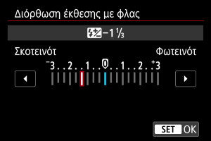 - Αν η διόρθωση έκθεσης με φλας έχει οριστεί με το φλας Speedlite, δεν μπορείτε να την ρυθμίσετε χρησιμοποιώντας τη μηχανή. Αν έχετε καθορίσει διόρθωση τόσο με τη μηχανή όσο και με το Speedlite, η ρύθμιση του Speedlite υπερισχύει της ρύθμισης της μηχανής.