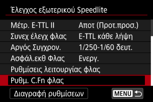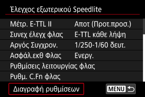 - Επιλέξτε [Διαγραφή ρυθμίσεων φλας] ή [Διαγραφή όλων C.Fn Speedlite].