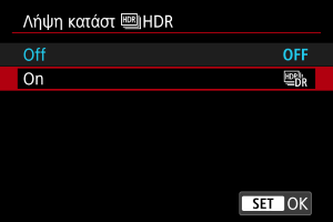 - Με την επιλογή [Κάθε λήψη], η λήψη HDR συνεχίζεται μέχρι η ρύθμιση του βήματος 2 να οριστεί σε [Off].