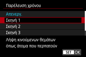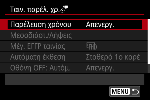 - Για να ακυρώσετε την εγγραφή ταινιών παρέλευσης χρόνου, ορίστε τη ρύθμιση [Παρέλευση χρόνου] σε [Απενεργ.].