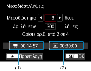 και ελέγξτε ξανά την τιμή του απαιτούμενου χρόνου (1) και του μεσοδιαστήματος (2) που εμφανίζονται στην οθόνη.