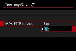 - Η εγγραφή ταινίας time-lapse τερματίζεται, εάν απενεργοποιηθεί η μηχανή και αλλάξετε τη ρύθμιση σε [Απενεργ.].