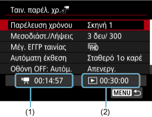 Υποδεικνύει τον χρόνο εγγραφής της ταινίας (τον χρόνο που απαιτείται για την αναπαραγωγή της ταινίας) κατά τη δημιουργία ταινίας time-lapse σε 4K ή Full HD, με χρήση των στατικών εικόνων που έχουν ληφθεί με το καθορισμένο μεσοδιάστημα.