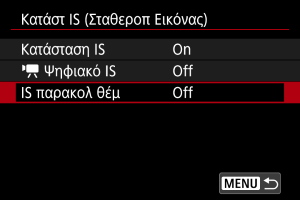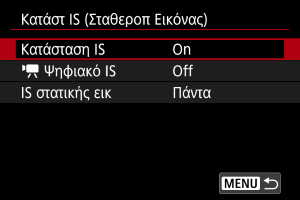 Ενεργοποιεί τη σταθεροποίηση εικόνας, χρησιμοποιώντας τη δυνατότητα κατάστασης IS της μηχανής.