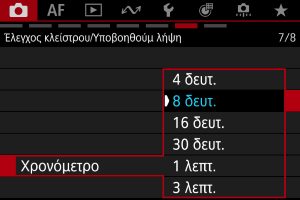 Μπορείτε να ορίσετε τον χρόνο για τον οποίο θα τρέχει το χρονόμετρο φωτομέτρησης (το οποίο καθορίζει τη διάρκεια εμφάνισης της τιμής έκθεσης) αφού ενεργοποιηθεί αυτόματα από μια ενέργεια, όπως το πάτημα του κουμπιού κλείστρου μέχρι το μέσον της διαδρομής του.