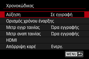 Για να ρυθμίσετε τον χρονοκώδικα, χρησιμοποιήστε τη ρύθμιση [: Χρονοκώδικας].