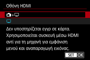 Οι λειτουργίες της μηχανής, όπως η προβολή εικόνων ή η εμφάνιση μενού, εμφανίζονται στην άλλη συσκευή μέσω HDMI, αλλά όχι στην οθόνη της μηχανής.