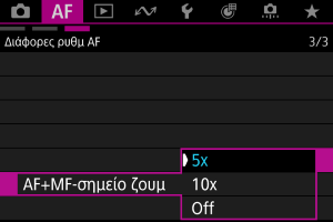 : AF+MF-σημείο ζουμ], η οθόνη μεγεθύνεται κατά 5 ή 10 φορές, κατά τη βελτίωση της εστίασης.