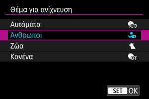 (Όταν το θέμα ανίχνευσης έχει οριστεί στο στοιχείο [Άνθρωποι], η επιλογή ζώων είναι δυνατή μόνο στη διάρκεια Servo AF.)