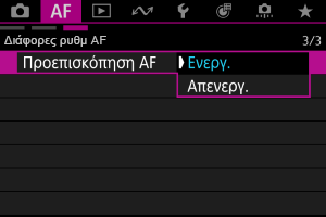 - Οι διαθέσιμες λήψεις είναι λιγότερες, εάν έχει οριστεί η επιλογή [Ενεργ.], επειδή η AF λειτουργεί συνεχώς και καταναλώνεται η ισχύς της μπαταρίας.