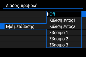 - Ορίστε τις ρυθμίσεις [Χρόνος προβολής], [Επανάληψη] (επαναλαμβανόμενη προβολή) και [Εφέ μετάβασης] (εφέ κατά την αλλαγή εικόνων) για τις στατικές εικόνες.