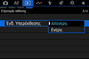 Μπορείτε να καθορίσετε μια ένδειξη υπερεκτεθειμένων φωτεινών τόνων που αναβοσβήνει στην οθόνη προβολής/αναπαραγωγής. Για να επιτύχετε λεπτομερέστερη διαβάθμιση στις περιοχές που αναβοσβήνουν, όπου θέλετε πιστότερη αναπαραγωγή της διαβάθμισης, ρυθμίστε τη διόρθωση της έκθεσης σε αρνητική τιμή και επαναλάβετε τη λήψη για καλύτερο αποτέλεσμα.