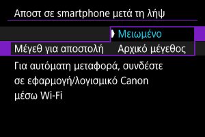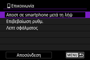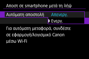 Οι λήψεις σας μπορούν να σταλούν σε smartphone αυτόματα. Πριν να ακολουθήσετε αυτά τα βήματα, βεβαιωθείτε ότι έχει διακοπεί η σύνδεση Wi-Fi μηχανής και smartphone.