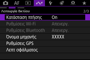 Εάν προτιμάτε να μην παραμένετε συνδεδεμένοι με τη μηχανή μέσω Wi-Fi ή το Bluetooth όταν είναι απενεργοποιημένη, ορίστε τη ρύθμιση [: Κατάσταση πτήσης] σε [On] ή ορίστε τη ρύθμιση [