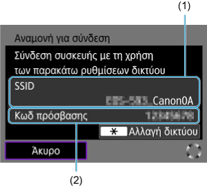 - Ελέγξτε τα στοιχεία SSID (1) και Κωδ πρόσβασης (2) που εμφανίζονται στην οθόνη της μηχανής.