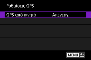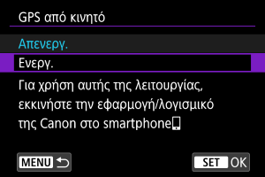 Μπορείτε να ελέγξετε την κατάσταση λήψης των πληροφοριών τοποθεσίας του smartphone από το εικονίδιο σύνδεσης GPS στις οθόνες για λήψη στατικών εικόνων ή εγγραφή ταινίας ( και αντίστοιχα).