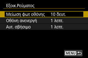 - Οι ρυθμίσεις [Μείωση φωτ οθόνης] και [Οθόνη ανενεργή] μπορούν να εφαρμοστούν όταν εμφανίζεται η οθόνη λήψης. Αυτές οι ρυθμίσεις δεν εφαρμόζονται όταν εμφανίζονται μενού ή προβολή εικόνων.
