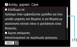 . Πατήστε το ξανά για έξοδο από την οθόνη βοήθειας. Για κύλιση της οθόνης όταν εμφανίζεται μια γραμμή κύλισης (1) στα δεξιά, περιστρέψτε τον επιλογέα