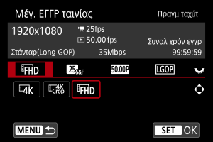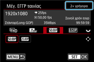 Οι ταινίες που αποτυπώνονται με εγγραφή σε αργή/γρήγορη κίνηση αναπαράγονται με αργή ή γρήγορη κίνηση. Δεν καταγράφεται ήχος. Ορίστε την ταχύτητα αργής ή γρήγορης κίνησης (ταχύτητα αναπαραγωγής) από την επιλογή [: Μέγ. ΕΓΓΡ ταινίας].