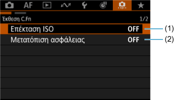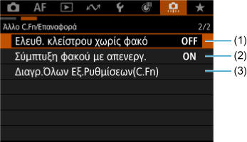 Με την επιλογή του στοιχείου [: Διαγρ.Όλων Εξ.Ρυθμίσεων(C.Fn)] διαγράφονται όλες οι τιμές Εξειδικευμένων ρυθμίσεων.