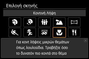 Χρησιμοποιήστε τη ρύθμιση [] (Κοντινή Λήψη) για κοντινές λήψεις μικρών θεμάτων, όπως λουλουδιών. Για να κάνετε τα μικρά αντικείμενα να δείχνουν πολύ μεγαλύτερα, χρησιμοποιήστε έναν ειδικό φακό macro (πωλείται ξεχωριστά).