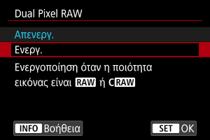 με ενεργοποιημένη αυτήν τη λειτουργία παράγει ειδικές εικόνες Dual Pixel RAW οι οποίες περιέχουν πληροφορίες dual pixel από τον αισθητήρα εικόνας. Αυτό λέγεται «λήψη Dual Pixel RAW».