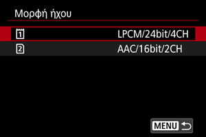 - Με την επιλογή [LPCM/24bit/4CH] είναι δυνατή η εγγραφή ήχου τεσσάρων καναλιών. Η επιλογή [AAC/16bit/2CH] περιορίζει την εγγραφή σε δύο κανάλια (με ένα μικρόφωνο).