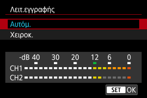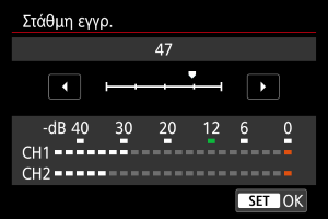 Μπορείτε να ρυθμίσετε το επίπεδο εγγραφής ήχου ανάλογα με τις ανάγκες. Ρυθμίστε το επίπεδο στο στοιχείο [Στάθμη εγγρ.].