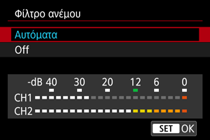 Ορίστε το στην επιλογή [Αυτόματα] (ή [On]) για μείωση της παραμόρφωσης του ήχου σε εξωτερικές σκηνές με αέρα. Όταν ενεργοποιείται η λειτουργία φίλτρου ανέμου, μειώνεται επίσης μέρος των ήχων χαμηλής συχνότητας.