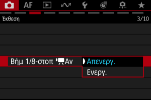 Οι τιμές διαφράγματος μπορούν να ρυθμιστούν σε βήματα 1/8 στοπ για εγγραφή ταινίας με φακούς RF. Είναι διαθέσιμο σε κατάσταση εγγραφής [], [], [] ή [].