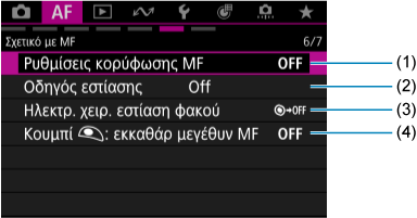 - Το στοιχείο [Κατάστ. εστίασης] εμφανίζεται όταν έχουν χρησιμοποιείται φακοί με διακόπτη κατάστασης εστίασης.