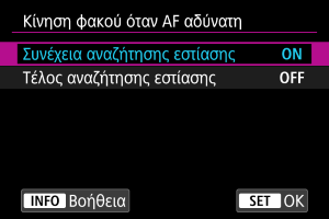 - Η επιλογή [Τέλος αναζήτησης εστίασης] συνιστάται για σούπερ-τηλεφακούς ή άλλους φακούς που προωθούνται σε μια μεγάλη περιοχή εστίασης, για την αποφυγή σημαντικής καθυστέρησης από τον οδηγό αναζήτησης εστίασης, εάν ο φακός απομακρυνθεί πολύ από τη θέση εστίασης.