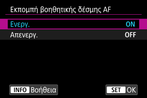 Απενεργοποιεί την εκπομπή βοηθητικής δέσμης AF. Επιλέξτε αν προτιμάτε να μην ανάβει η βοηθητική δέσμη AF.