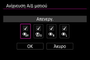 : Ανίχνευση Α/Δ ματιού], υποδεικνύει ότι η προεπιλεγμένη ρύθμιση έχει τροποποιηθεί.