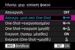 : Ηλεκτρ. χειρ. εστίαση φακού] έχει οριστεί σε [Ενεργοπ. (πραγμ. μέγεθος)] ή [Ενεργοπ (One-Shot→μεγέθ.)].