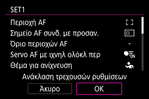 ]. Επιλέξτε [ΟΚ] για να αποθηκεύσετε τη ρύθμιση. Για λεπτομέρειες σχετικά με τις περιοχές AF, ανατρέξτε στην ενότητα Περιοχή AF.