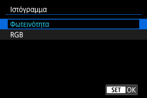 Τα ιστογράμματα εμφανίζουν τα επίπεδα του σήματος σε όλο το τονικό εύρος. Διατίθεται οθόνη φωτεινότητας (για τον έλεγχο του γενικού επιπέδου έκθεσης και της συνολικής διαβάθμισης) και οθόνη RGB (για τον έλεγχο του κορεσμού και της διαβάθμισης του κόκκινου, του πράσινου και του μπλε). Μπορείτε να αλλάξετε το ιστόγραμμα που εμφανίζεται, πατώντας το πλήκτρο όταν εμφανίζεται η ένδειξη [